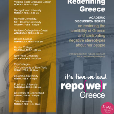 RepowerGreece is an international public diplomacy initiative which started in 2011, aiming at empowering a new way of thinking and engagement in order to successfully face the rising challenges and move forward. With more than 50 events and initiatives organized in Greece and abroad, with the participation of more than 4.500 students from middle and higher education, business leaders, academics and media representatives, and with the support of esteemed national and international organizations, RepowerGreece is a dynamic initiative that reflects the commitment, credibility and creativity that propel Greece forward.